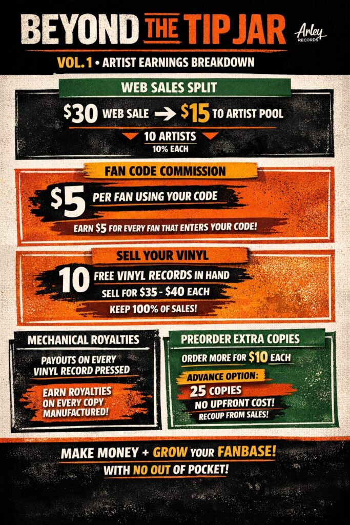 We will give each artist a promo code for their fans to use. Fans will receive a discount and the artist will earn a $5 referral bonus for each album sold in addition to splitting the net profit on the sale.